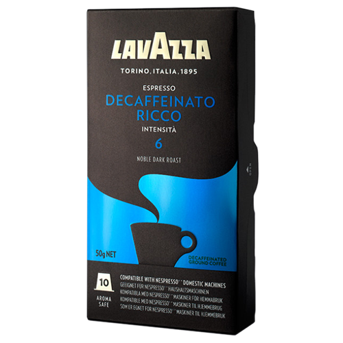 Capsules Compatible with Nespresso Original machines with Lavazza Ricco Decaffeinated coffee the tasty espresso with cereal and dried fruit aroma and reduced caffeine content. 6 Packs of 10 single serve Nespresso pods with the Lavazza Decaffeinato Ricco decaffeinated coffee blend 60 cups total Velvety decaffeinated dark roast with sweet rich flavor and aromatic notes of cereals and dried fruit. A blend of pure and lightly roasted Arabicas from South America Volluto Decaffeinato reveals sweet and biscuity flavours reinforced by a hint of acidity and a fruity note.